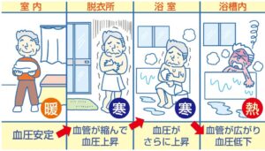 急激な温度差によって血圧が大きく変動し、失神・心臓発作・脳血管障害などを引き起こす健康リスクです。