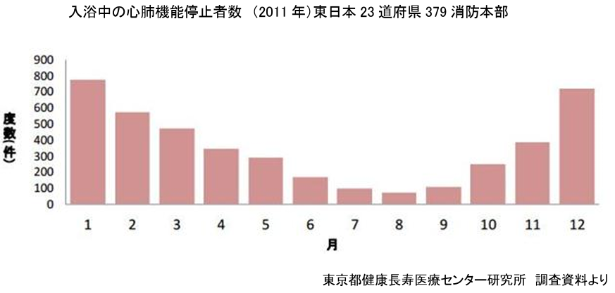 ”外気温が低くなる1月は、入浴中に心肺機能停止となる人が、最も少ない8月のおよそ11倍であり、増加する原因は、ヒートショックによるものといえます。”