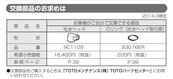 取り扱い説明書を見ると、交換部品の情報がありました。でも、ちょっと情報が古い(2014.3現在と記載あり)
