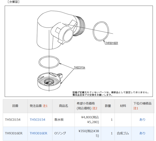 さらに調べると、上記表の中に「下位の補修品があり」となっている。あり、の部分をクリック。
