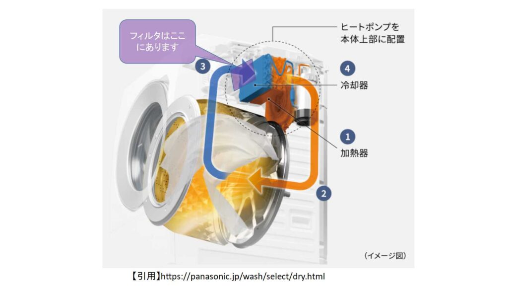 乾燥機は、内部で「温かい空気」を循環させながら、衣類の水分を蒸発させる仕組みです。下図を参照してください。「PanasonicのHPから引用」したドラム式洗濯乾燥機の例です。基本はどの機種も同じで、空気が流れる道にフィルターがついています。